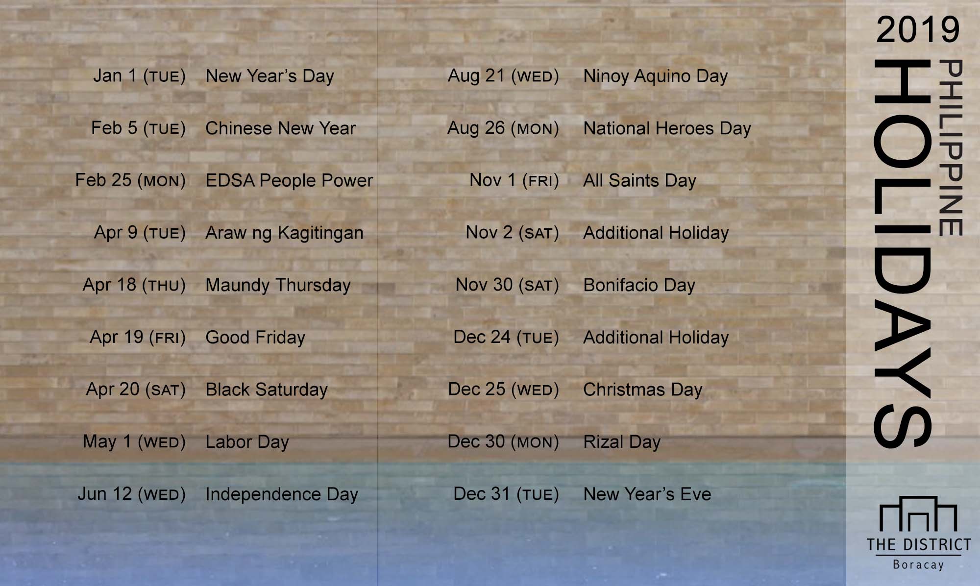 The merriment doesn’t end there. Here is the list of holidays for 2019. Mark your calendars and note these dates for your next trip to Boracay!