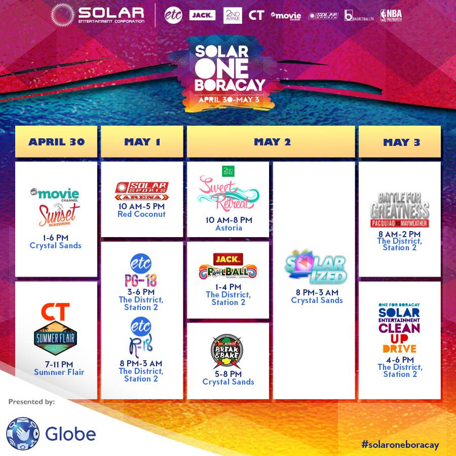 Excited for LaBoracay? Here’s Solar One Boracay’s complete schedule of activities at THE STRIP (in front of The District Boracay), from April 30 – May 3! See you there!