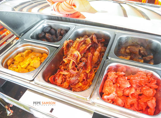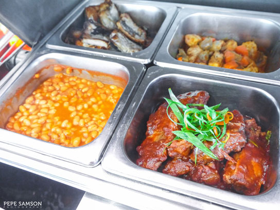 The hot dishes section features delectable international and Filipino viands such ribs, Korean beef stew, curried sausages, longganisa, tocino, bangus, beans, and of course, bacon. The rice tray is refilled alternately with plain rice, garlic rice, or other variants, such as a Singaporean fried rice.