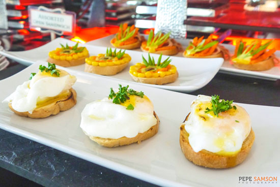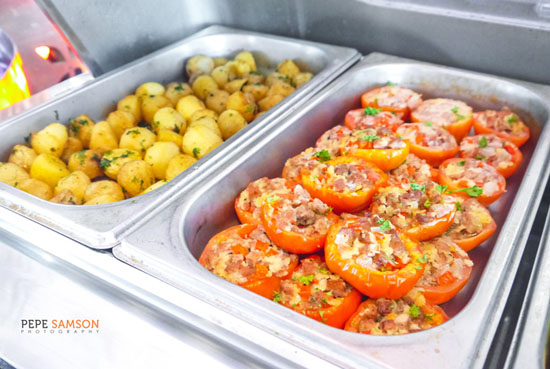 For only PhP600 net, diners can partake of a fine selection of Filipino and international dishes. There’s a soup-of-the-day and a bread station stocked with loaves, pan de sal, rolls, and croissants, as well as a variety of beautiful, open-faced sandwiches. The appetizer station sits nearby—I loved the marble potatoes and the stuffed tomatoes.