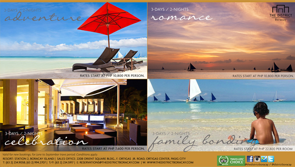 Got some great news for all of you! The District Boracay is bringing back its exciting Adventure, Romance, Celebration and Family Bonding packages which will be valid from June to September 2014!